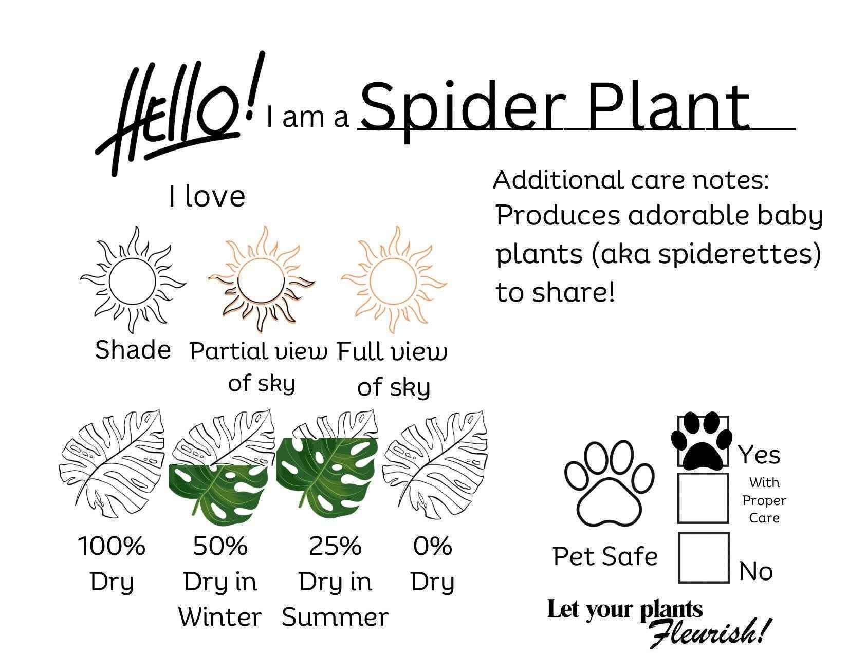 - Description: The Spider plant is a flowering perennial native tropical South Africa. The leaves of the spider plant are thin ribbon like strands which end in a point and grow upward and bend downward giving it the look of a spider, this particular variety will have leaves which grow outward and upward.The Spider plant produces small white flowers that grow along a long stalk independent to the leaves of the spider plant. Also known for their air purifying qualities,the spider plant is a great companion to any household of office.